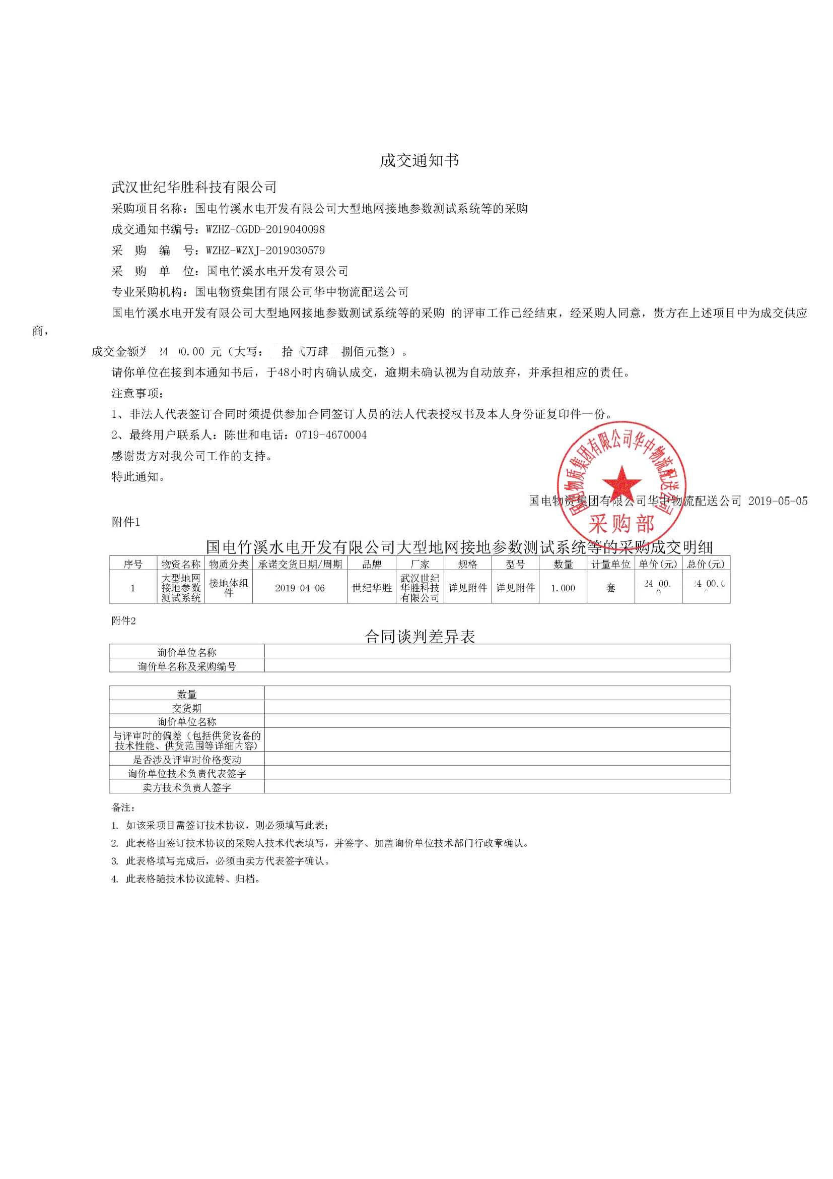 ? ? 武漢華勝公司電子商務(wù)部經(jīng)過大家的不斷努力,最終拿下“國電竹溪水電開發(fā)有限公司大型地網(wǎng)接地參數(shù)測試系統(tǒng)等的采購”項(xiàng)目。